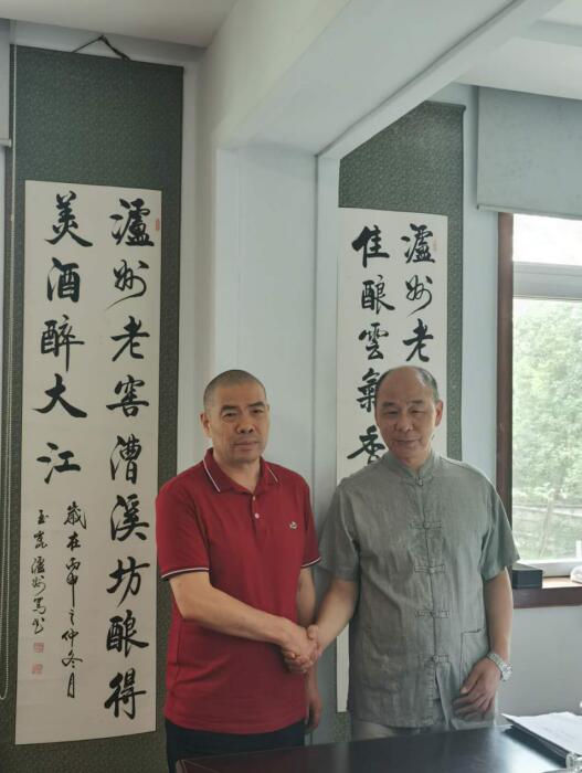 上海靈壁商會(huì)會(huì)長(zhǎng)王德發(fā)先生(左)蒞臨公司考察合作。與公司釀酒大師瀘州濃香老窖傳統(tǒng)技藝第21代傳人陳靖余(右)合影